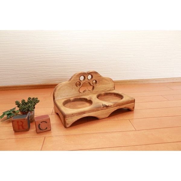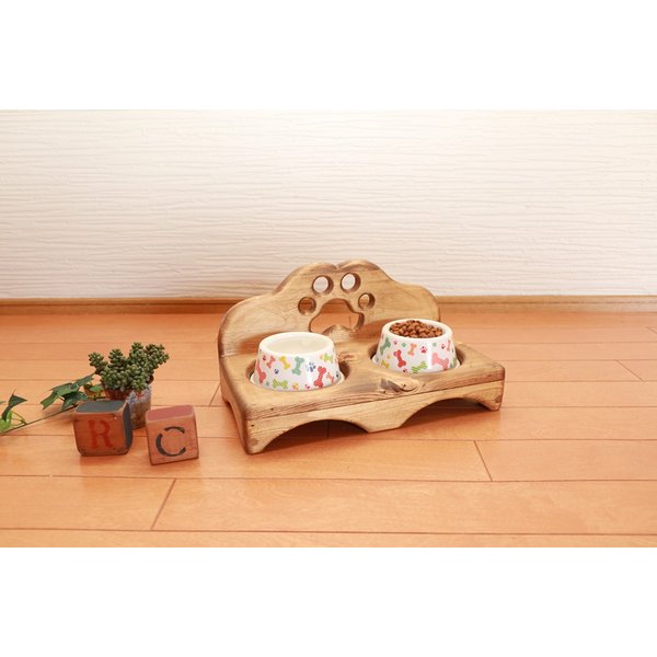 カントリー調でワンちゃんネコちゃんが楽な姿勢で食事が出来るペット用えさ台です。背面の肉球のくり抜きがとっても可愛い食器台です。