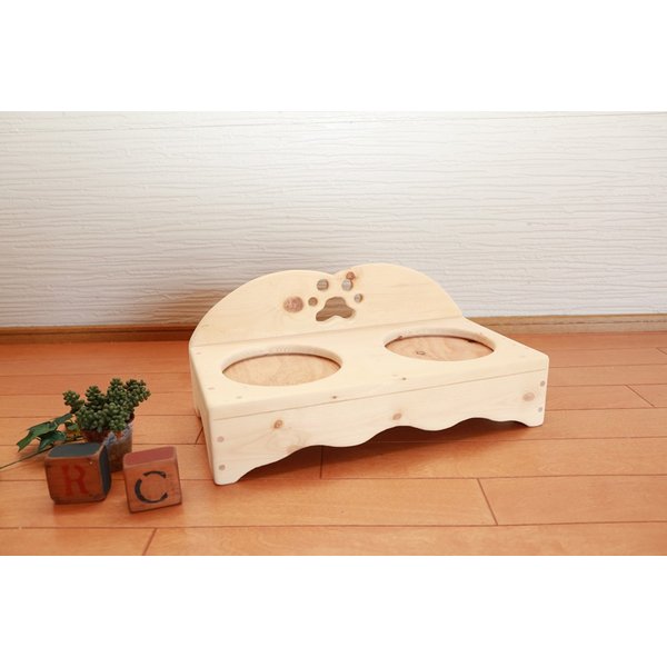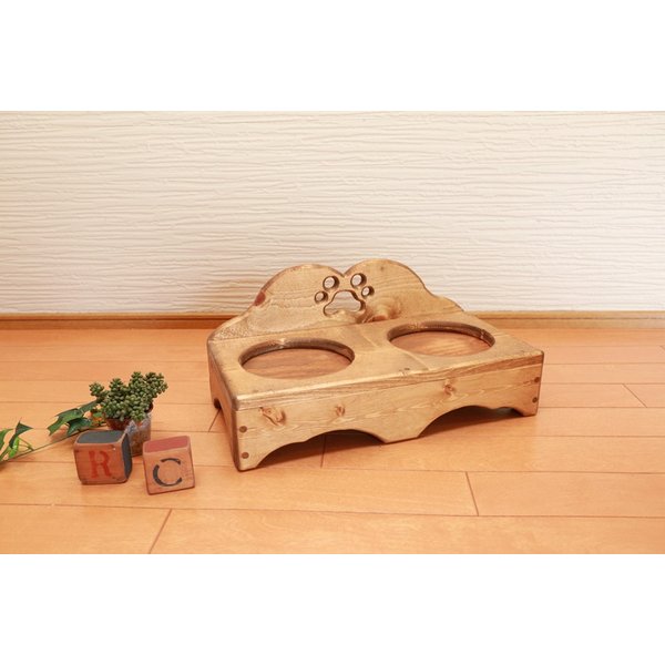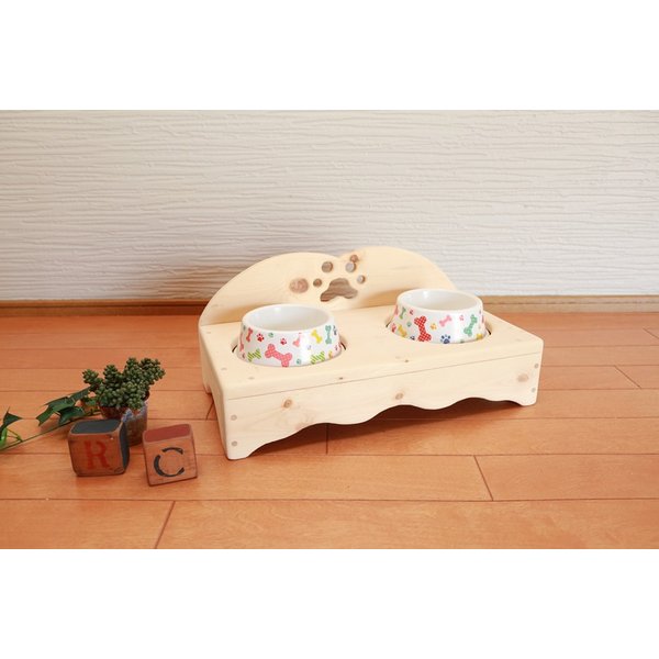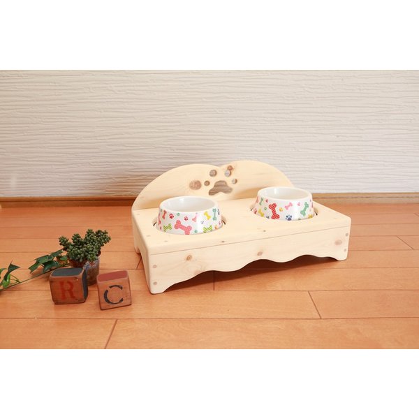 カントリー調でワンちゃんネコちゃんが楽な姿勢で食事が出来るペット用えさ台です。背面の肉球のくり抜きがとっても可愛い食器台です。
