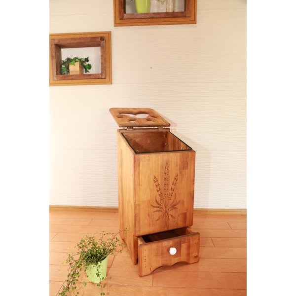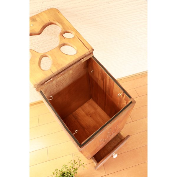 カントリー調で手作りの麦の穂柄が可愛いゴミ箱 ダストボックスです。 上ふたの部分は肉球にくり抜きがされてます。 下段には収納に便利な引き出し付きで、引出しにはごみ袋のストックなどを入れてもらえます。 上フタを開けてもらうとフックが4点付いているので袋を吊下げるこも出来ます。 大きいサイズなのでたっぷり入りとても使いやすいです。