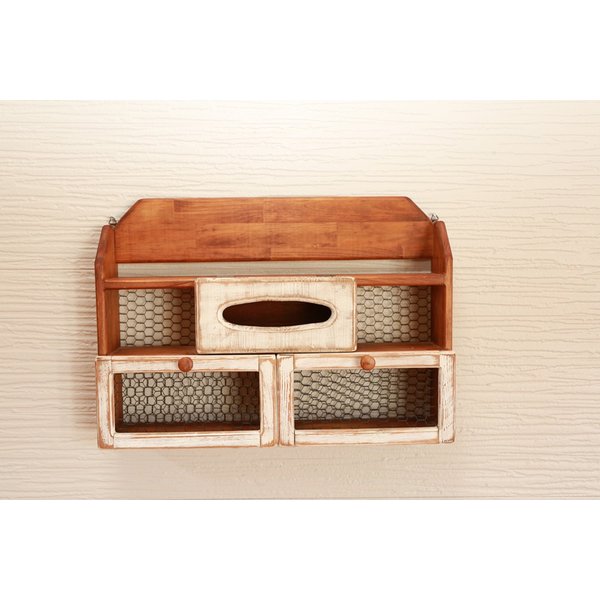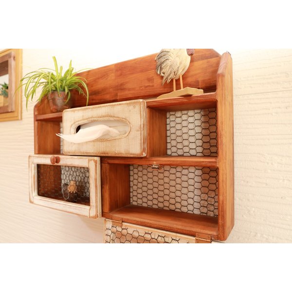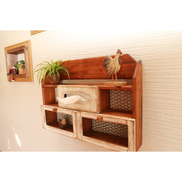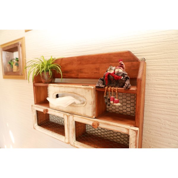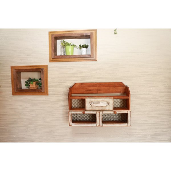 カントリー調なインテリア、シンプルでナチュラルテイストたっぷりな木製の壁掛け棚 ワイヤーウォールシェルフです。 シンプルなデザインは、どんなインテリアにも合わせやすく ティッシュケースを収納出来るのでとても便利です。 背面と扉部分に金網を使ったこだわりの商品です。 お気に入りの小物や雑貨、観葉植物などをディスプレイしてもお洒落です。 三角フック2点付きなの簡単にお取付出来ます。