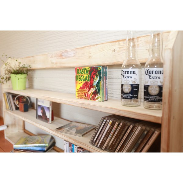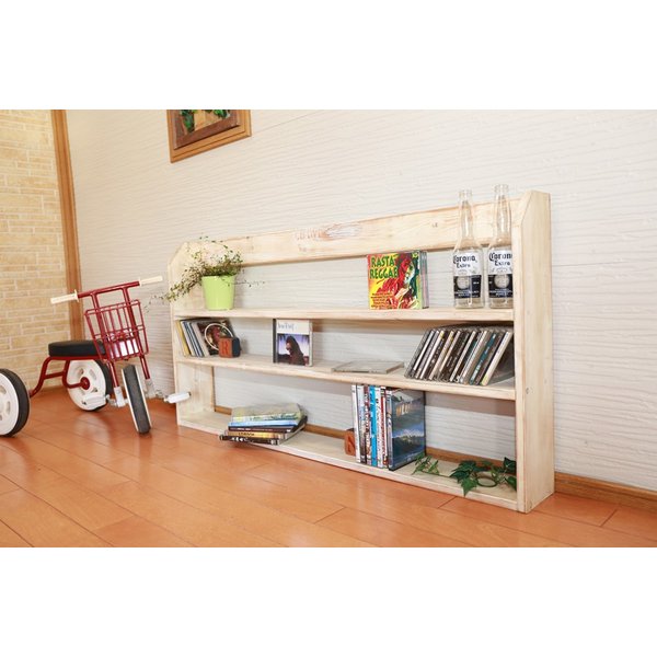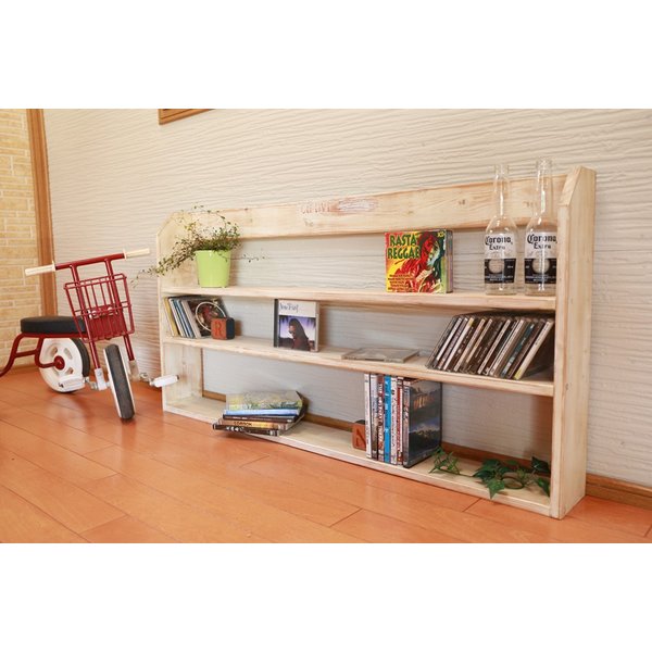 ナチュラルテイストでヴィンテージ感のあるお洒落なCD.DVDラック オープンシェルフです。 シンプルなデザインは、どんなインテリアにも合わせやすいです。 上段のフリースペースにはお気に入りの小物や雑貨、インテリアなどのディスプレイとしても使用できます。 中段はCDを収納出来るサイズ、下段はDVDを収納出来るサイズになっています。大容量で収納力は抜群です。 裏面に三角フックが2つ付いていますので壁掛けとしてもお使いいただけます。