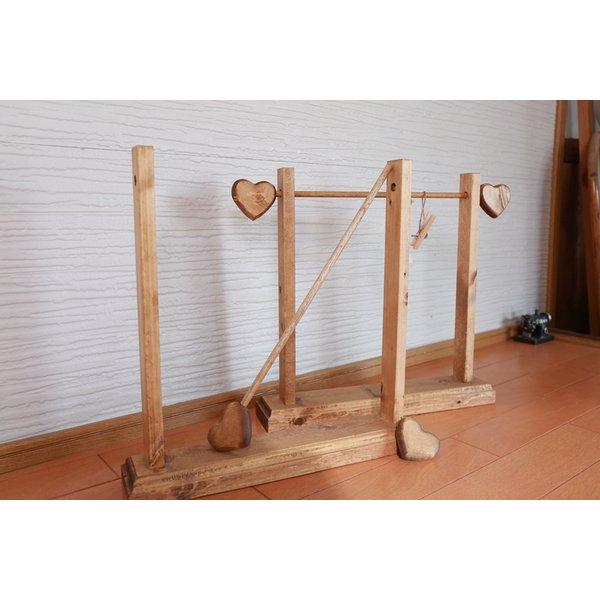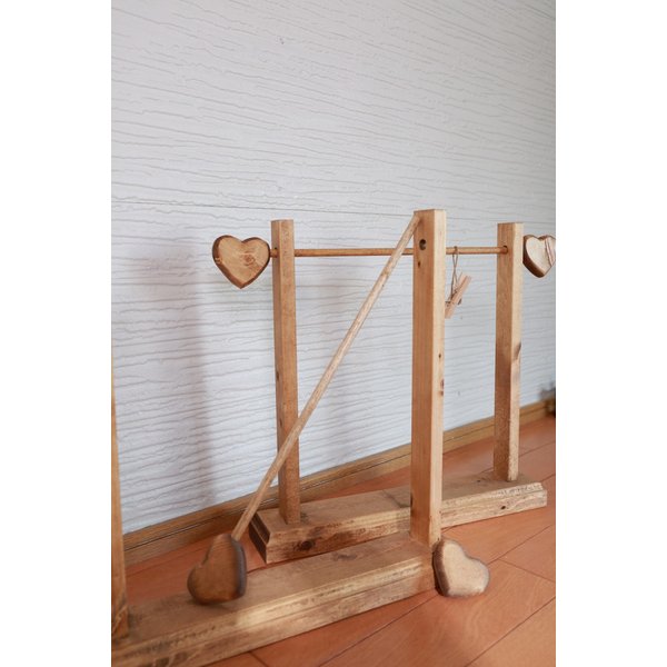 ハートが可愛い木製アクセサリースタンドです。 葉書、写真、アクセサリーをかけたりと使い方は色々広がります。 サイズ的にもテーブルの上やカウンターテーブルの上でもお使い頂けると思います。 お店などではメニューやPOPを吊下げて使っていただくととてもお洒落ですね♪ ハートの部分は取り外しが出来るので物を掛けたりするのもとっても便利です。 表示価格は1点のお値段です。