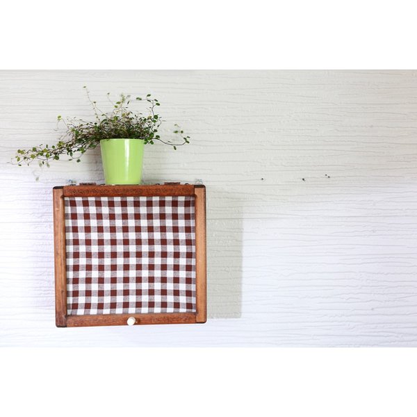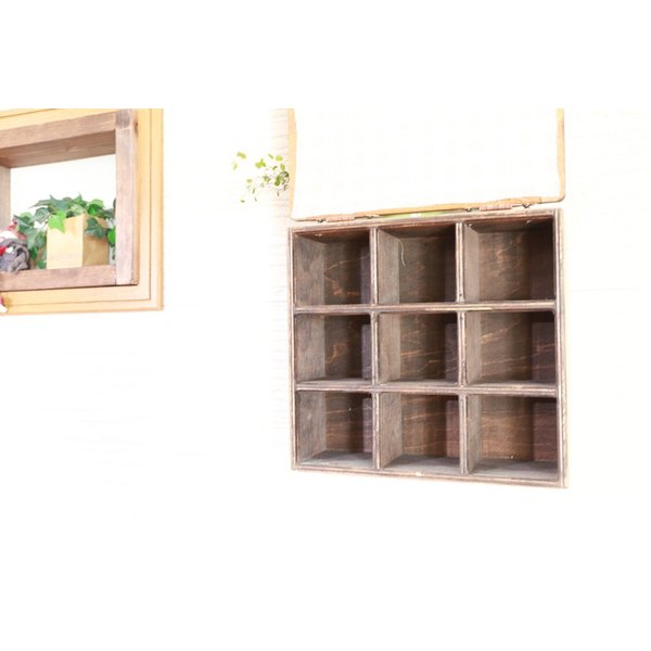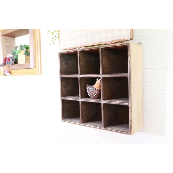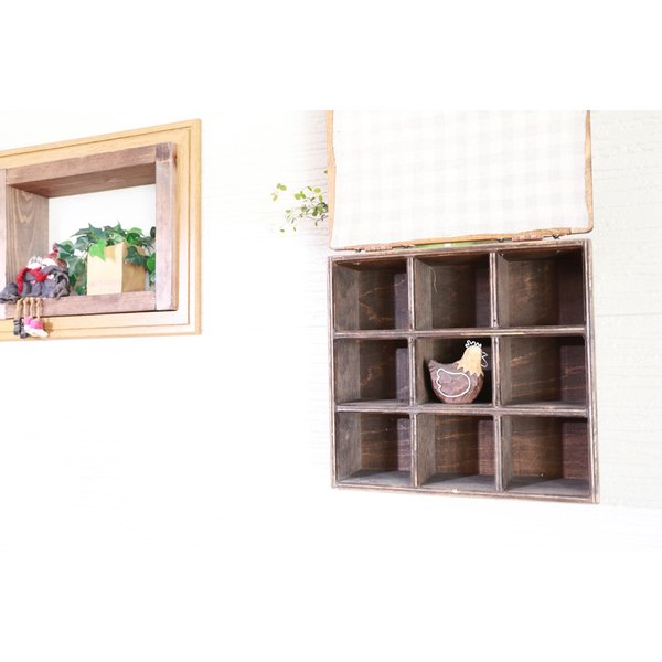 木製壁掛けフタ付きウォールシェルフです。フタ付きでフタの部分のチェック柄がとても可愛いです。 中の棚は細かく9個に分かれているので小物やアクセサリーなどを収納するのに便利です。 上の部分のスペースには飾り棚として観葉植物なども置く事も出来ます。 フタ付きなので外から見えず大事な物も収納できます。 裏面に三角フックが2つついていますので壁掛けとして、またはカウンターの上などに置いて飾り棚としてもお使いいただけます。