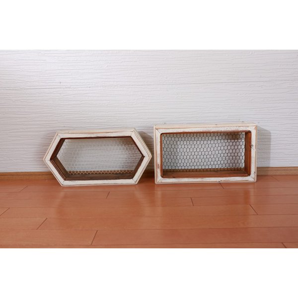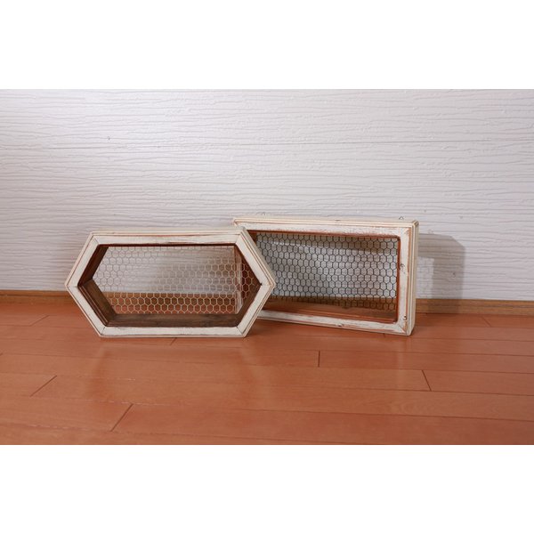 ワイヤーネットが優しい雰囲気の木製 壁掛シェルフ 飾り棚です。 裏面に三角フックが2つついていますので壁掛けとして、またはカウンターの上などに置いて飾り棚としてもお使いいただけます。 ペイントのムラがシャビー感たっぷりで、とてもお洒落なシェルフです。 タイプは六角形と長方形がございます。 表示価格は1点のお値段です。
