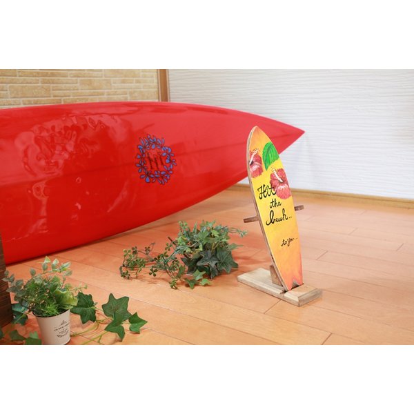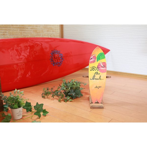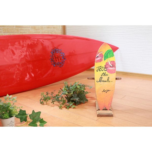 木製 サーフボードのオブジェです。こちらはシンプルにお色を塗りハイビスカスを描いたミニサーフボードです。 お部屋お店のオブジェとして、または車の中などどこに置いてもお洒落です。 片面のみの塗装になります。防水加工はしていませんがワトコオイルで仕上げています。 世界に1つオンリーワンのとても素敵なサーフボードオブジェになります。 お色違いやメッセージ入りサーフボードなど多数販売いたしておりますので 是非ご覧ください。