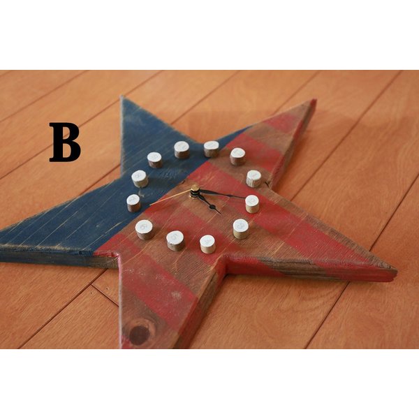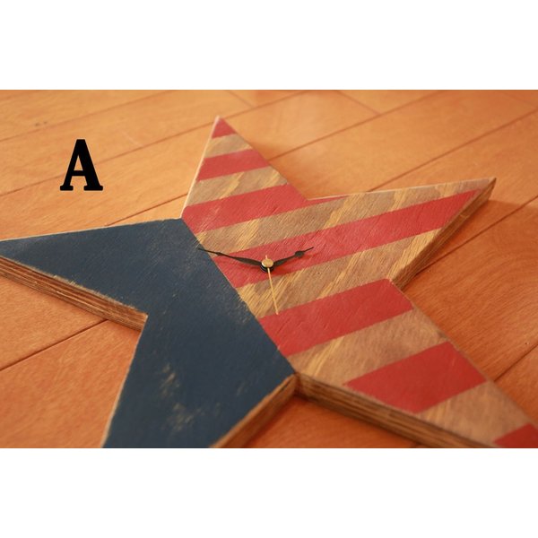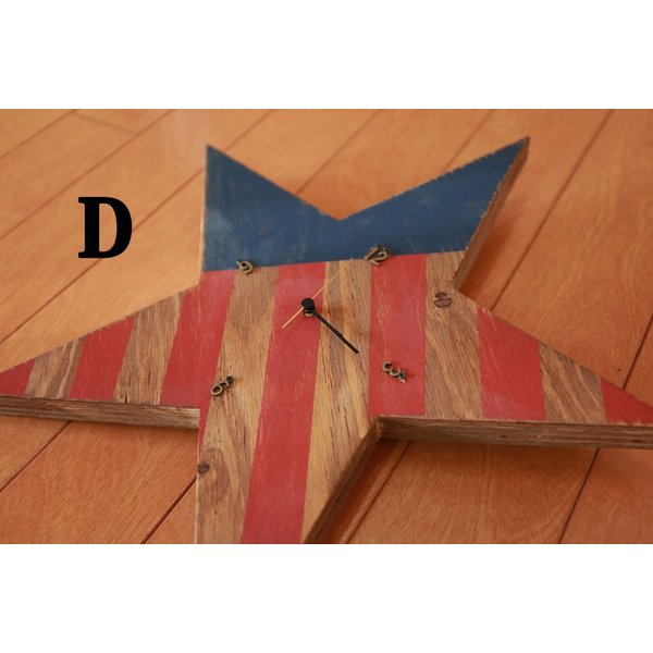 アメリカ星条旗柄の星時計です。置き時計にも掛け時計にもなります。 星条旗をイメージしてヴィンテージっぽく仕上げています。 三角フックがついていますのでお取付が簡単にできます。 星時計タイプが4種類ございますのでお選びください。 表示価格は1点の値段です。